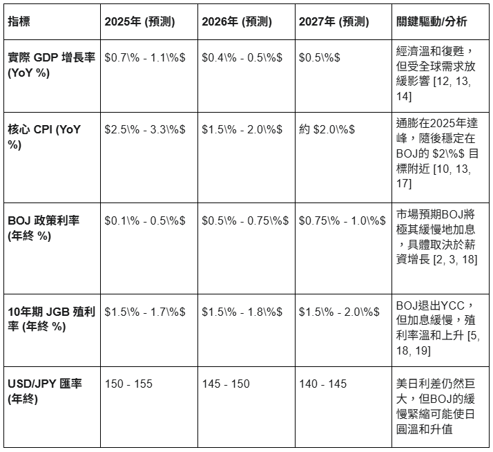 重要的是,目前的通膨正顯示出從「成本推動型」轉向「需求拉動型」的跡象。BOJ在2024年3月的聲明中指出,「薪資持續穩定增長的可能性很高」,這表明日本正處於形成「薪資-價格」正向螺旋的初期階段。BOJ預計2025財年(截至2026年3月)的核心CPI將落在 2.5% 至 3.0% 之間,隨後在2026財年放緩至 1.5% 至 2.0%,並在2027財年穩定在 2% 左右。