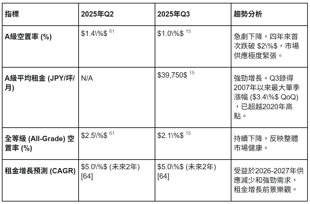 空置率: 根據CBRE的數據,2025年第二季度,東京A級辦公室空置率四年來首次跌破 2% 的門檻,降至 1.4%。到2025年第三季度,空置率進一步收緊至 1.0%,市場極度緊張。Cushman & Wakefield 在2025年第三季度的報告更指出,空置率已降至 1% 以下,為五年來首次。