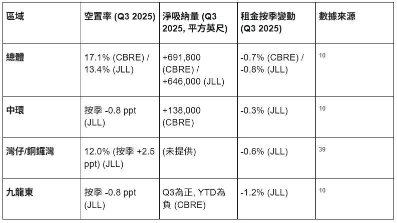 九龍東 (Kowloon East):依然掙扎。雖然Q3在數據上空置率也下降了0.8個百分點,但CBRE指出其年初至今的淨吸納量仍為負值。租金跌幅(-1.2%,JLL數據)遠高於中環。