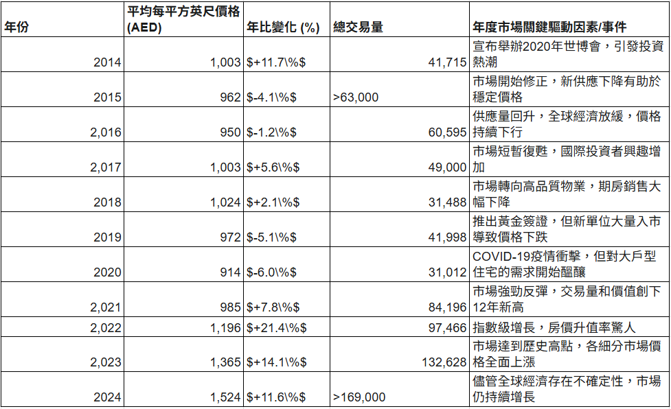 交易量與交易額: 市場展現出非凡的動能。2024年上半年,交易總量年增長30%,總價值超過4,800億新台幣。這一趨勢貫穿2024年並延續至2025年第一季度,該季度交易量達到42,200宗,年增長23.1%,總價值達1,144億迪拉姆(AED),年增長29.6%。這表明自後疫情時代的繁榮以來,市場需求持續強勁。