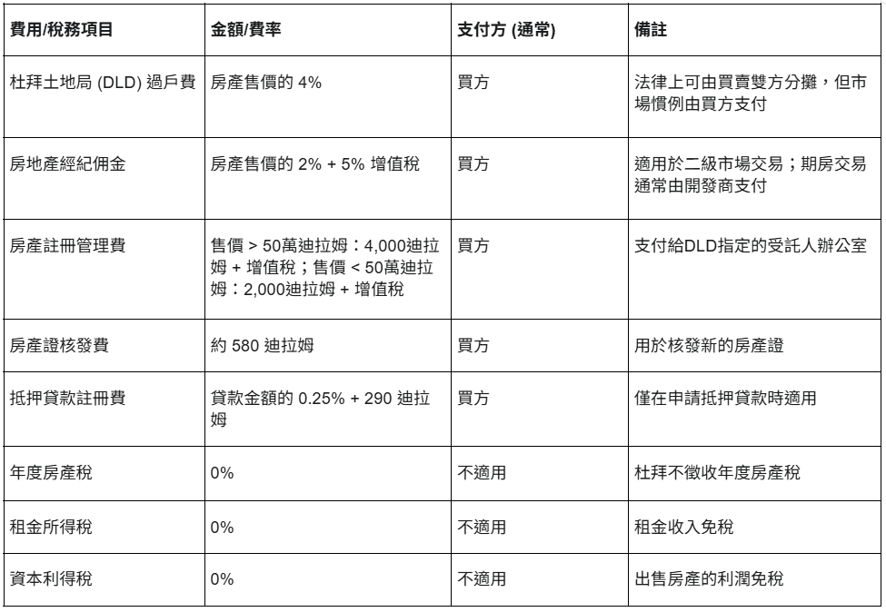 杜拜土地局 (DLD) 過戶費: 此費用為房產售價的4%,通常由買賣雙方平均分攤,即各支付2%。不過,這可以協商,在某些情況下,買方會同意支付全部費用。