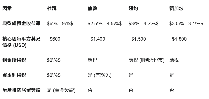稅收: 對收入和資本利得實行0%的稅收政策,與其他全球樞紐的重稅負擔形成鮮明對比,使得杜拜的總回報在數學上更具優勢。