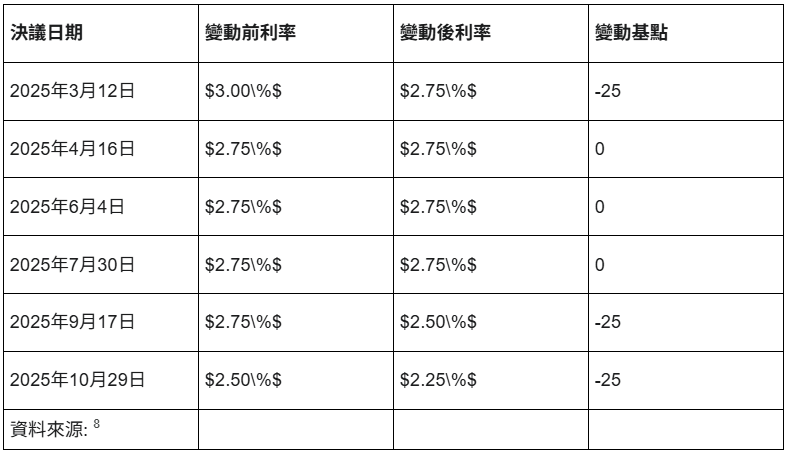 2025年,加拿大央行(BoC)啟動了貨幣政策的寬鬆週期,以應對經濟增長乏力和貿易摩擦帶來的阻力。數據顯示,央行的隔夜利率目標從年初的3.00%開始,經過數次下調,分別在3月降至2.75%,9月降至2.50%,並最終在10月29日降至2.25%,達到了自2022年7月以來的最低水平。