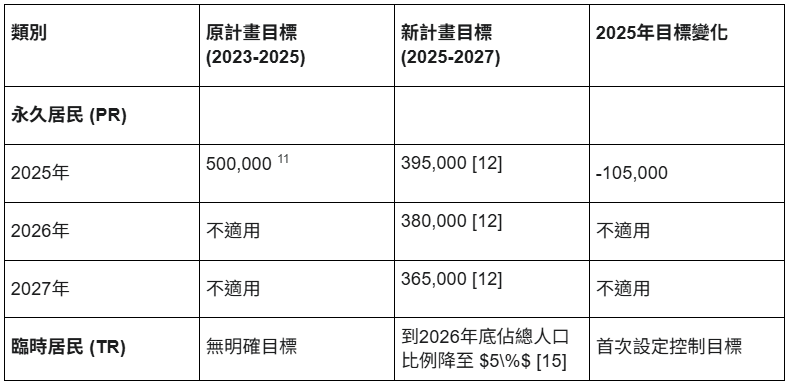 政策調整的核心在於大幅削減未來三年的移民目標。此前,政府計劃在2025年接收50萬名永久居民(PR)。然而,根據最新的《2025-2027年移民水平計畫》,2025年的永久居民目標被大幅削減至39.5萬人,減少了10.5萬人,降幅高達21%。此後目標將繼續下降,2026年為38萬人,2027年為36.5萬人。此外,該計畫首次為臨時居民(TRs),包括國際學生和臨時外國工人,設定了控制目標,旨在到2026年底將其佔總人口的比例從超過6.5%降至5%。