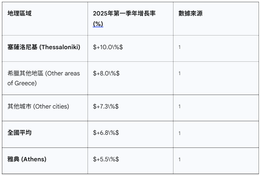區域轉移:從增長放緩的雅典轉向由本地經濟和基礎設施驅動的、增長更快的市場,例如塞薩洛尼基 (Thessaloniki)(2025年第一季增長 $10.0\%$ 1)和克里特島 (Crete)(增長 $14.12\%$ 13)。