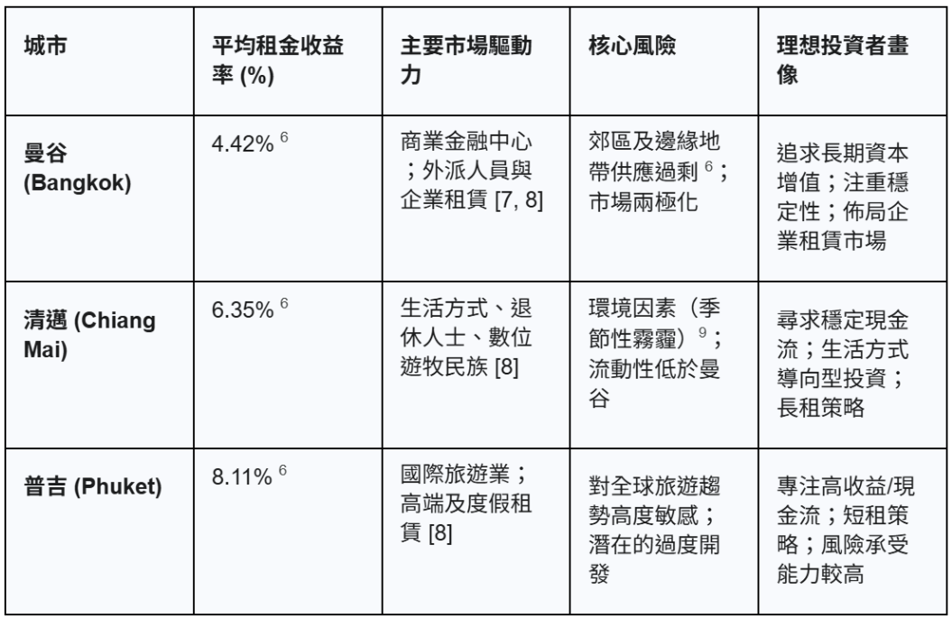 以下是對泰國三大主要房地產市場的直接比較,結合了核心數據與市場驅動因素,旨在提供一個全面的戰略視角。