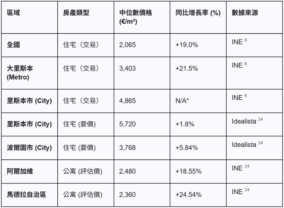 大里斯本(Metro): 相比之下,更廣泛的大里斯本 (Grande Lisboa) NUTS 3 區域正經歷爆炸性增長。該區域的中位數價格為 3,403 €/m² 6,INE 報告 2025 年 Q2 同比增長高達 +21.5% 6。