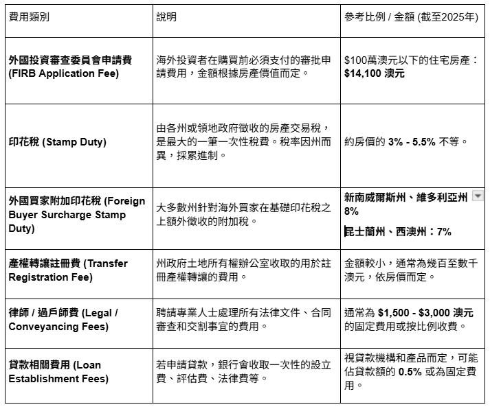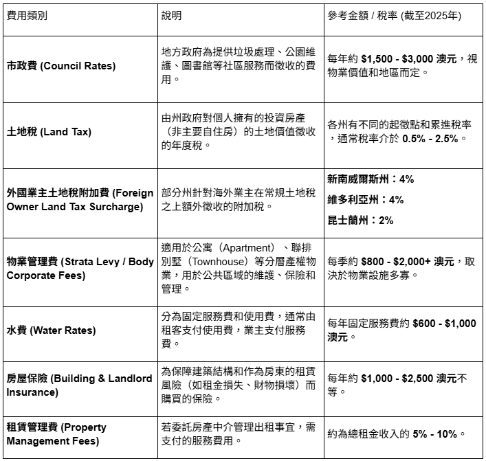 了解稅費結構是成功投資的關鍵一環。澳洲的稅費主要分為購買階段的一次性費用和持有階段的持續性費用。