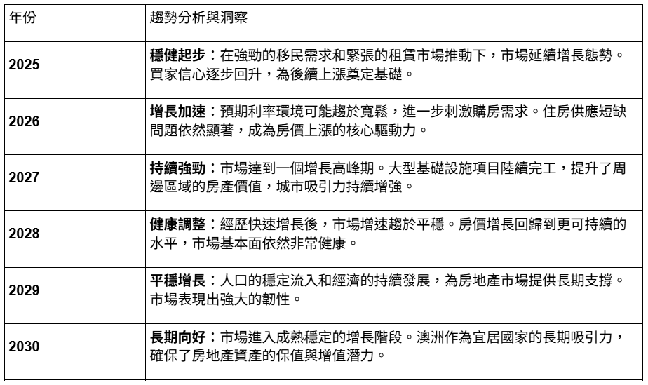 基於穩健的經濟基本面和持續的供需失衡,澳洲房地產市場預計將在未來五年長期向好,市場進入成熟穩定的增長階段。澳洲作為宜居國家的長期吸引力,確保了房地產資產的保值與增值潛力,進入一個4% - 6%持續的穩定上升。